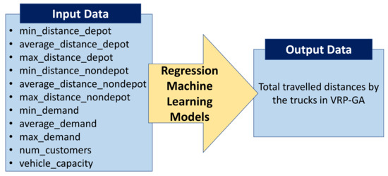In this study, regression machine learning models are used to predict the objective value of the VRP-GA (the total distances traveled by the trucks). The list of input and output data is shown in Figure 5. The input data represent the characteristics of each vehicle routing problem instance. Each input datum is presented as follows.