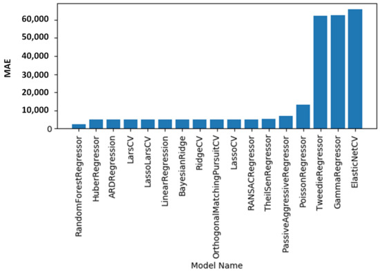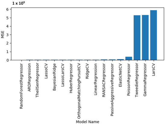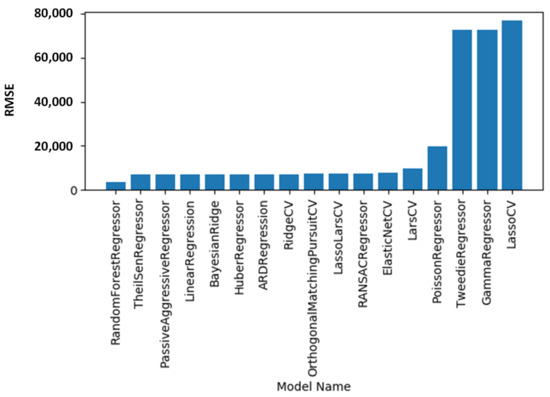 The regression machine learning models are evaluated via the mean squared error (MSE) values, as shown in Figure 7. The three best models with the lowest MSE values are random forest regression (12,204,263.19), ARDRegression (51,956,577.89), and TheilSenRegressor (58,285,906.56). The regression machine learning models are evaluated via the root mean squared error (RMSE) values, as shown in Figure 8. The three best models with the lowest RMSE values are random forest regression (3493.46), TheilSenRegressor (7634.52), and PassiveAggressiveRegressor (9610.48). A list of all MAE, MSE, and RMSE values for each model is shown in Table 4. The experiments with the MAE, MSE, and RMSE metrics show that the best model is random forest regression.