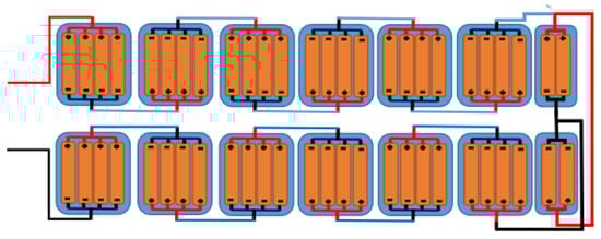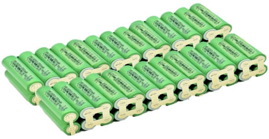 Figure 1. It consists of basic 18,650 battery packs with a nominal capacity of 2500 mAh at 3.6 V. The configuration includes a small pack of four batteries connected in parallel, equivalent to a 3.6 V, 10 Ah battery. Thirteen of these packs are connected in series to make a total pack or equivalent battery of 10 Ah at 46.8 V.