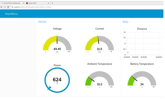 Moreover, a Human–Machine Interface (HMI) has been developed to graphically represent the telemetry data obtained from the vehicle. The HMI is implemented using the Node-RED dashboard, which allows for real-time visualization of key parameters such as temperature, current, and voltage. Additionally, the HMI provides detailed insights into the battery voltage, current consumed by the electric vehicle, power output, distance traveled during the test, ambient temperature, and battery temperature. This comprehensive visualization enables operators to monitor the vehicle’s performance and battery status effectively, ensuring optimal operation and timely detection of any anomalies.