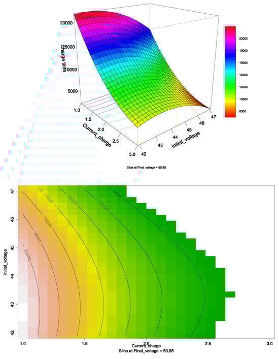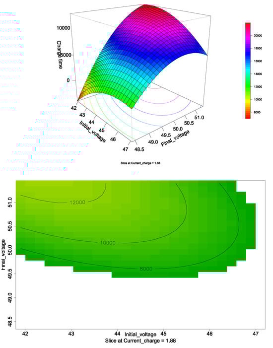Figure 10 illustrates the response surface and contour plot for varying charging currents and initial voltages. The optimal region is observed to be around 6000 s. As illustrated by the response surface, an increase in the initial charging voltage results in a reduction in the charging time. Furthermore, it is evident that a higher charging current results in a shorter charging time, with the initial voltage having a lesser influence on this relationship.