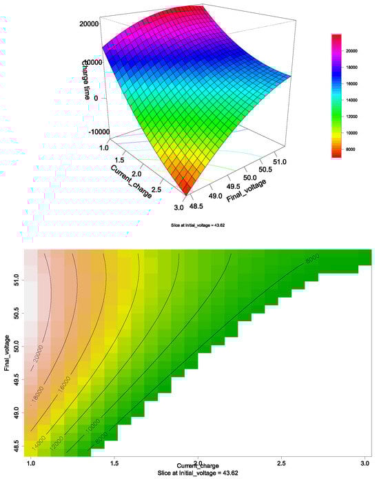 Figure 11 illustrates the response surface and contour plot for the final voltage of the battery bank in relation to the charging current. It can be observed that as the final charging voltage increases, the charging time will also be longer. The time required for the battery to reach a full charge can be reduced by increasing the charging current, as illustrated in the contour plot, where the optimal region is approximately 8000 s. Nevertheless, it is of paramount importance to regulate this phenomenon, as an increase in the charging current also results in an elevated battery temperature. Such temperature increases have the potential to impact performance, reduce the battery’s lifespan, and pose safety risks.