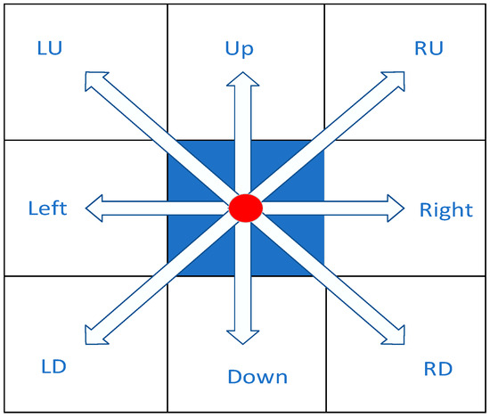 In 1968, Peter Hart et al. proposed the traditional A* algorithm [3]. The algorithm is a direct search method that is most effective for finding the shortest path in a static road network and is also an efficient algorithm for solving many search problems. The algorithm is a heuristic search algorithm that explores the state space, evaluates each search position, obtains the optimal solution, and then continues searching from this optimal solution to find the next optimal solution, until reaching the target destination. The traditional A* algorithm selects node expansion directions as shown in Figure 4.