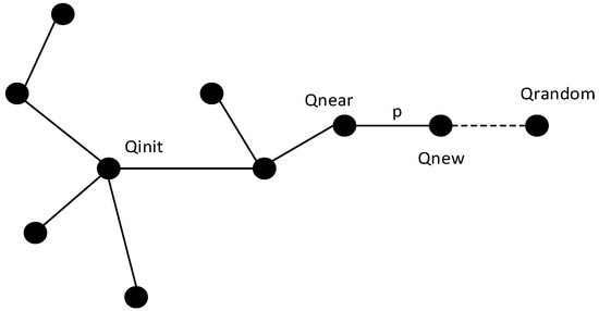 - The curvature of the expansion step is constrained by the maximum steering angle of the vehicle’s front wheel, denoted as , as indicated by the condition in Equation (4).