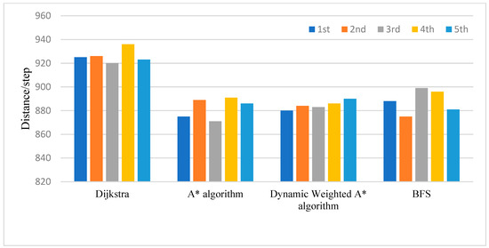 This algorithm can ensure the shortest path from the starting point to all other nodes, with high correctness and stability. However, the Dijkstra algorithm uses a greedy algorithm, ignoring the distribution of obstacles. Therefore, when searching in space, it will traverse all nodes, leading to a large amount of data that the algorithm needs to process. For path planning in smart parking, which requires high real-time performance, a large amount of data will increase the time cost of parking path planning [45,46,47]. Moreover, this algorithm is used to solve the single-source shortest path problem and does not consider negative weight edges [48]. Therefore, it is not suitable for path planning in images with negative weight edges because the algorithm assumes that all weight edges are non-negative. Negative weight edges will cause path planning to fail.