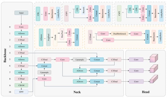 Within the limitations of YOLOv5, the primary aim of this study is to develop a traffic sign detection algorithm that combines lightweight design with high precision, ensuring a balance between accuracy and efficiency. Moreover, this research aims to improve the detection of smaller targets. We present a novel traffic sign detection method named YOLO-ADual, whose structure is shown in Figure 1.