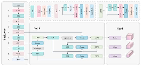 Before the introduction of YOLOv1 [], the R-CNN series of algorithms held a prominent position in the domain of target detection. The R-CNN series exhibited a notable level of detection accuracy. Still, its detection speed fell short of real-time performance due to its two-stage detection network architecture, resulting in substantial criticism. YOLO’s core idea is to convert the target identification task into a regression issue. This transformation involves using the entire map as input to the neural network and only using a neural network to obtain the position of the bounding box and its corresponding class. YOLOv5 is an advancement iteration derived from YOLOv3 [] and YOLOv4 []. The overall architecture of YOLOv5 is shown in Figure 2. The dataset comprises five distinct models, specifically YOLOv5n, YOLOv5s, YOLOv5m, YOLOv5l, and YOLO5x. Those YOLOv5 models exhibit a progressive enhancement in detection accuracy, accompanied by a gradual decline in detection speed. Individuals can select an appropriate model to attain an optimal balance between precision and efficiency. In contrast to its predecessors, YOLOv4 and YOLOv3, YOLOv5 employs the focus structure within its backbone component and incorporates three distinct output heads to facilitate multi-scale prediction. The same project team develops YOLOv8 [] as YOLOv5. This model is advanced and currently at the forefront of technology. The general framework of this model bears resemblance to YOLOv5. YOLOv8 gave up the prior anchor-based approach and instead adopted the anchor-free concept. Moreover, YOLOv8 introduced the C2f module to replace the CBL module in YOLOv5. The architecture of C2f primarily draws inspiration from the ELAN concept in YOLOv7 [] and C3 modules. This enables YOLOv8 to obtain ampler gradient flow information while maintaining a lightweight approach.