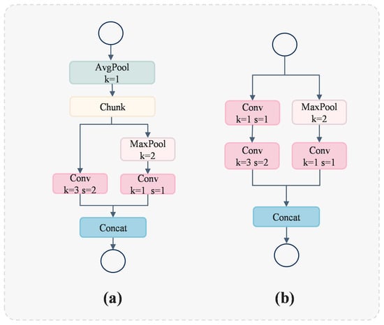 Traditional convolutional neural networks (CNNs) often necessitate an extensive number of parameters and FLOPS to attain acceptable levels of accuracy. This is due to the significant redundancy present in the intermediate feature maps generated by prevalent CNN architectures. In this study, we utilize the Adown module introduced in YOLOv9 [] to improve the Conv module of YOLOv5s. The Adown module is enhanced from the downsample network transition block in YOLOv7. A comparison of the structures of these two downsample networks is shown in Figure 3. The transition block module’s right section employs Maxpool and a convolution kernel with a stride of 1 for processing. Conversely, the branch’s left section utilizes convolution kernels of 1 × 1 and 3 × 3 for the convolution operation []. The Adown module performs the AvgPool operation before splitting, the right part of the branch retains the original transition block operation, and the other half only uses 3 × 3 convolution kernels for the convolution operation and deletes the 1 × 1 convolution. The Adown module has been improved to reduce the feature loss and enhance the feature learning efficiency.