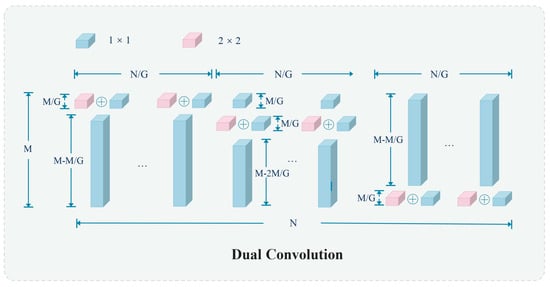 DualConv is a lightweight deep neural network designed to optimize both spatial information capture and computational efficiency. As illustrated in Figure 4, DualConv combines 3 × 3 and 1 × 1 convolutional kernels []. The 3 × 3 convolutional kernel enhances spatial information extraction, while the 1 × 1 convolutional kernel facilitates interactions between feature channels and information integration, minimizing additional parameters and computational complexity. By integrating these two convolutional kernels, DualConv processes the same input feature mapping channels concurrently, with each group of convolutional kernels handling a subset of the input channels separately. The outputs are then merged, promoting efficient information flow and integration across different feature map channels. This structural design preserves the network depth and characterization capability, optimizing information processing for kernel feature extraction and reducing computational complexity and model size. Thus, DualConv is particularly suitable for resource-constrained environments.