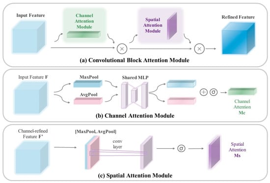 Convolutional Block Attention Module (CBAM) focuses on essential features and screens out unnecessary features to enhance the network representation []. Figure 5a shows the schematic structure of CBAM. It contains a channel attention module (CAM) and a spatial attention module (SAM). Firstly, CBAM focuses on the important features through CAM and then focuses on the important locations of these features through SAM. This method can effectively help the network focus on the image’s key information and improve the features’ representation strength. Given the input feature , first, perform the one-dimensional convolution of the channel attention module, and then multiply the convolution result by the original image to obtain the CAM output result , as shown in Equation (1):