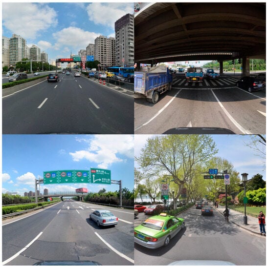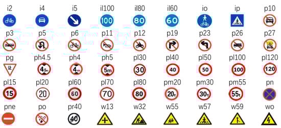 The Tsinghua–Tencent 100K dataset is a massive, high-resolution dataset of traffic signs created by Tsinghua University and Tencent []. The collection comprises 100,000 photos with a resolution of 2048 × 2048, gathered from the Tencent Street View map under various lighting and weather situations. The TT100K dataset represents a practical scenario for traffic sign detection on mobile devices, containing 221 categories of Chinese traffic signs and includes over 30,000 annotated occurrences of traffic signs across 10,000 pictures. Sample images are shown in Figure 6. According to the experimental findings, the native dataset contains a substantial amount of traffic signs, with a small proportion that cannot be effectively learned. We analyzed the number of traffic signs in each dataset category to address this issue. To mitigate the sampling variations induced by the diverse categories of traffic signs in the dataset, we selected 45 categories with a count exceeding 100. The chosen images depict traffic signs of various sizes, ranging from 8 × 8 to 400 × 400 pixels. These signs constitute a small portion of the entire image, representing between 0.001% and 4% of the total area.