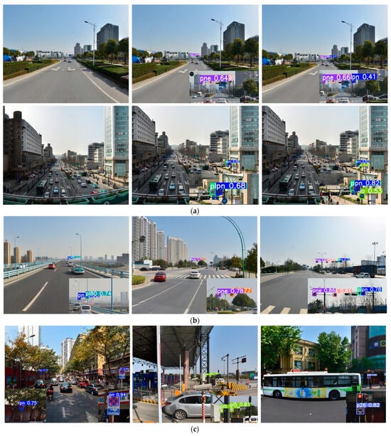 To comprehensively evaluate the detection capabilities of our model, we have visualized its outputs. Figure 10a presents the detection results for both YOLOv5s and YOLO-ADual. Both models were initialized with the same learning rate and utilized the Adam optimizer. The original image is displayed in the first column, followed by the visual detection outcomes of YOLOv5s and YOLO-ADual in the second and third columns, respectively. Given the small size of the traffic sign in the original image, an enlarged version is provided in the corner to facilitate closer examination of the detection details. Upon inspecting the first comparison row in Figure 10a, it is evident that YOLO-ADual successfully detects the ‘pn’ traffic sign, whereas YOLOv5s does not. Similarly, in the second comparison row, YOLO-ADual detects the ‘io’ traffic sign, while YOLOv5s not only fails to detect ‘io’ traffic signs but also shows a significantly lower confidence level compared to our model. Figure 10b illustrates the detection results of YOLO-ADual on small targets, demonstrating the model’s proficiency in identifying distant and diminutive traffic signs with high confidence, which is crucial for traffic sign detection (TSD) tasks and the safety of autonomous vehicles. Additionally, as depicted in Figure 10c, the model showcases its capability to detect traffic signs under challenging conditions, including occlusion and shadows, and to accurately identify small targets. This highlights the model’s robustness in recognizing traffic signs amidst complex surroundings.
