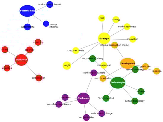 - Technologies (purple bubbles), with keywords like “battery technology”, “autonomous driving”, “renewable energy”, and “Vehicle-to-Grid”, pointing to critical technological advancements.