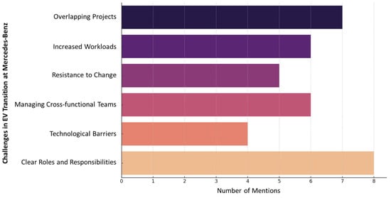As illustrated in Figure 3, there are several primary obstacles faced by Mercedes-Benz during its shift to EVs. The interviewees identified key challenges such as overlapping projects, increased workloads, resistance to change, managing cross-functional teams, technological barriers, and the need for clear roles and responsibilities as the most crucial barriers. Overlapping projects and increased workloads were frequently mentioned, indicating that managing traditional and new EV initiatives simultaneously strains resources. Resistance to change also emerges as a significant hurdle, particularly among employees accustomed to traditional automotive technologies. Challenges in managing cross-functional teams underscore issues with communication and coordination across departments. Technological barriers reflect the need for new expertise and adaptation to emerging EV technologies. Lastly, the lack of clear roles and responsibilities indicates organizational structure issues that hinder efficient transition. Figure 3 encapsulates the complex and multifaceted nature of transitioning to EVs, emphasizing areas that require focused attention and strategic intervention.