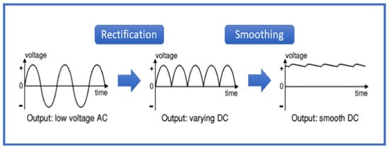 Electric motors can create a lot of stray transients and voltage spikes from the battery and the motor due to unpredictable loads that are needed to power the motor for accelerations and decelerations. This effect can cause stress on the motor and result in heat due to a resistance build-up. To overcome this problem, a smoothing capacitor bank can be placed in parallel to the load across the rectifier output. Figure 2 illustrates the AC/DC waveform showing the rectifier output and the smooth output. Though, as the output voltage increases, the smoothing capacitors will rise and fill up like a reservoir. Thus, when the input voltage decreases, the smoothing capacitors will discharge and flow back to the supply. The main advantage of using smoothing capacitors connected to the load is that it will reduce the ripple effect on the output waveform, and thus, it will not create a noisy DC-varying output [40].