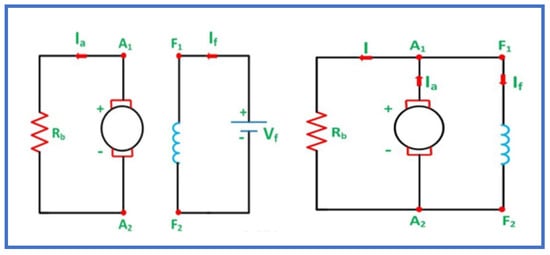 As the motor turns from the kinetic energy without any supply needed to power the motor, it creates its own self-excited electromotive force. Hence, when a load is placed on the motor, it creates a counter electromotive force (emf), pushing against the emf that is already being created by the motor; as this effect will cause the motor to gradually slow down. However, to make the current rating safe, a resistance is connected in series to the field windings, as illustrated in Figure 4 (see [44]. To create a self-excited field within the motor, the field connections must be reversed so that the current flows in the correct direction. This is so that the residual counter electromotive force is created. Subsequently, the motor will operate as a self-excited series generator (see Figure 4).