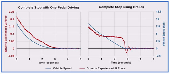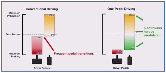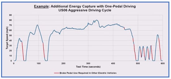 There are different applications and developments in regenerative braking systems, including their use in cars, called one-pedal braking. Vasiljević et al. [52] presented a recent review on the applications and working principles of regenerative braking in EVs. On a general note, there are four (4) advantages have been identified as being important for regenerative braking applications by General Motors, as presented by Michaluk [53]. The first is the ease of use, which provides continuous control with fewer pedal transitions, as depicted in Figure 5; the acceleration pedal can dynamically adjust itself to provide responsive propulsion and braking, as depicted in Figure 6; they have good performance with jerk-free stops and less skill required, as depicted in Figure 7; and lastly, they result in energy savings, as seen in the development of electric vehicles (EVs), as shown in Figure 8. The energy savings for one-pedal driving improve the real-world application and development of the electric vehicle (EV) range by increasing regeneration without expensive blended braking systems. This can be seen in the additional energy capture plot for one-pedal driving for the US06 aggressive driving cycle. As the driver continues to propel, energy is captured over time and regenerated in the electric vehicle, thus saving energy.