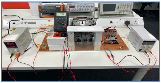 The circuit construction consists of different elements; from the motor drive circuit, which uses four MOSFET power transistors and an Arduino Uno that controls the speed of the DC motor, to the batteries. The first DC motor is connected to the second DC motor to turn it into a generator; as the generator then charges up the supercapacitor bank. Once the capacitor bank is fully charged, it starts to discharge from the load that has been placed across it. All the components were placed on a small piece of plywood; so, it was easy to transport and to outline and present the individual sections within the project (see Figure 9).