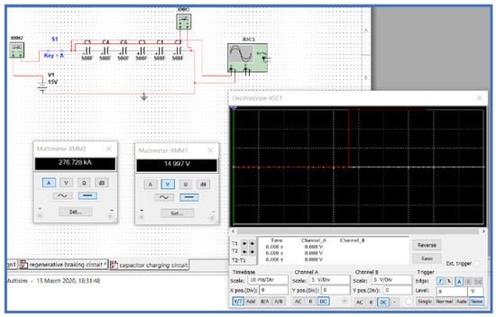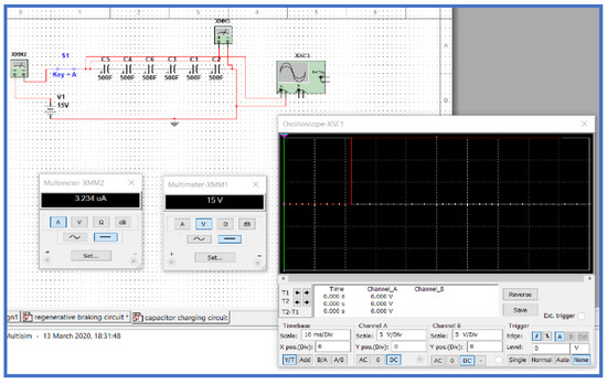 Within this study, six supercapacitors were connected in series, with an individual rating of 2.7 V and 500 F. When they were connected in series, they had a rating of 16.2 V and 83.3 F. Figure 10 shows the capacitors charging from a 15 V input DC supply; when using the Multisim software, it provided an unlimited power rating, which means that it is very difficult to compare to when building the project practically. Figure 10 also shows an Amp rating of 276 kA, which is unrealistic and would not happen practically. However, the behavior of the circuit indicates that the capacitors were charging up fully instantly rather than having a steady state current and charging over a period of time. Finally, it was fully charged after some time. Figure 11 shows an Amp rating of 3.2 µA, which indicates that the capacitor is fully charged, and on the oscilloscope, the waveform also shows that it is fully charged.