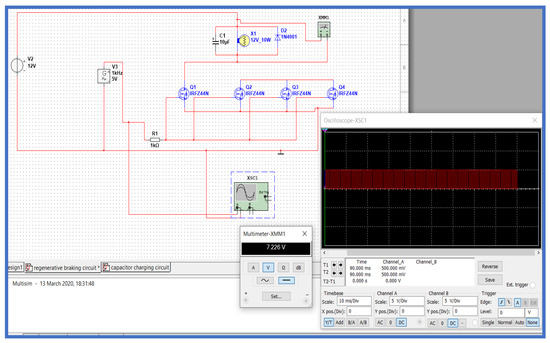 The circuit design was constructed on Multisim; this was to try and achieve a fully working circuit through a simulation before constructing it practically. This method helped to find errors and design the circuit; so, it was fairly easy to create the circuit practically because there was a circuit diagram to follow. Since Arduino Uno Atmega boards are not available on Multisim’s current version to use within the circuit, there was a triggering signal that could be used instead to turn the MOSFET transistors on via a gate-triggering pulse. Thus, the network in Figure 12 with different charging outputs on the Multimeter. In this design, a 12 V bulb was used instead of using a DC motor for indicating the load, purely for the circuit indication purposes. Contrarily, the actual circuit used a universal series-wound DC motor.