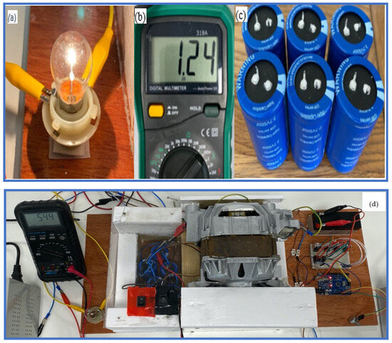 Experimental resources: (a) a 12 V 22 W bulb load, (b) a 12 V bulb’s current rated using a meter, (c) a supercapacitor bank and (d) the experimental setup showing the red switch, black switch, DC motor, light bulb, Multimeter, testing terminals, connection cables and the circuit board.