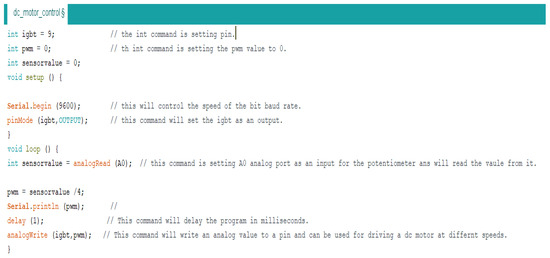 The program for the regenerative braking system was created on a compiler and uploaded onto an Arduino processor. The reason that this program had to be made was because the motor that drives the generator needed to be controlled using a speed control circuit. The circuit used four MOSFETS that were connected together, and the gates of the MOSFETS were connected together to pin 9, as shown in Figure 15 on line one: the command is setting pin 9 as the output to the MOSFETS; so, when the pulse-width-modulated signal is set via the potentiometer, the PWM signal will go down pin 9 to trigger the MOSFETS speed setting.