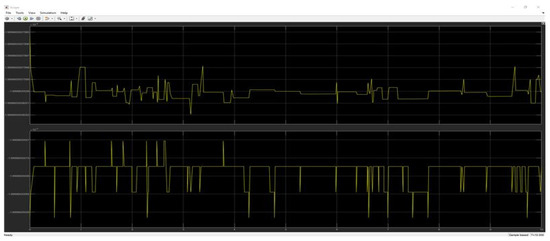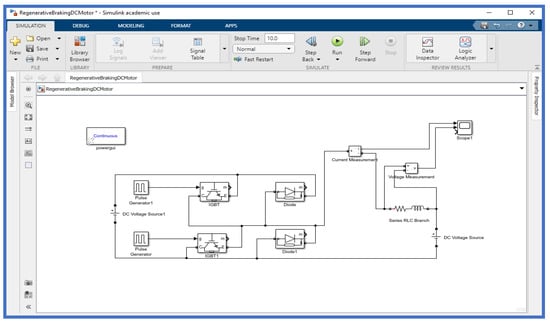 The numerical model for this study was developed using the MATLAB Simulink package, academic edition, MATLAB version 2020a. The model for the regenerative braking system using DC motors in Simulink was also designed as shown in Figure 16 and the scope readings in Figure 17, Figure 18 and Figure 19. Based on the design, it was simplified to fit a case study for braking using the Simulink package of MATLAB 2020a. This was found to be suitable for the current study. However, it was limited to the demonstration in this study, but leaves room for further works. In these readings, it can be observed that the regenerative braking model was successfully modeled using the DC motor, which can also be carried out using supercapacitors. For the model, two IGBTs, two Diodes, two Pulse generators, two DC voltage sources, one current measurement, one voltage measurement, one Series RLC branch, one scope with two channels, and one Continuous power GUI were utilized in the Simulink model. Different variants of the model were also established based on the individual unit needed. Figure 16 represents a simplified version of the regenerative braking model developed and considered in this study. From the three scope readings in Figure 17, Figure 18 and Figure 19, we can see the amplitude of charge for the current being tested on the circuit.