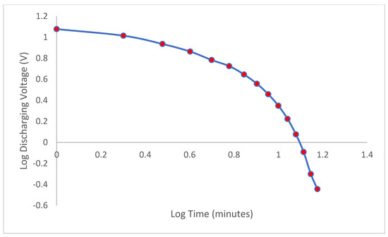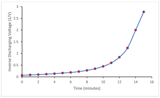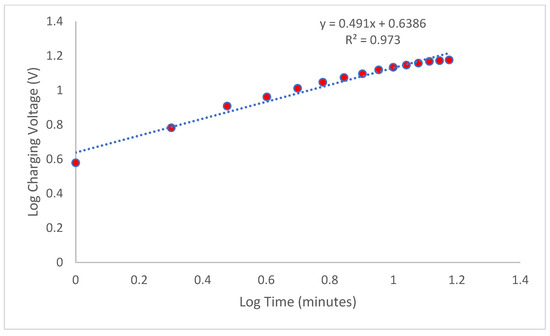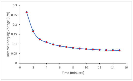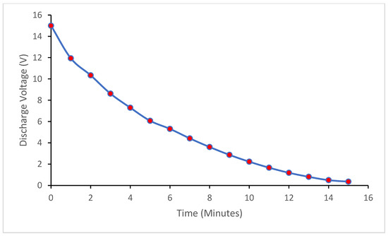 The capacitor charging and discharging graphs were created using Excel based on the findings of the experiment. The graphs show the voltage rating against time at a given period. As the capacitor bank started to charge up, the voltage readings were recorded at certain time intervals. During the charging process, there were 15 readings taken at each minute for the total duration of 15 min. The 16th reading taken was the time of origin, at 0 s. Using this method, the data were gathered and used to gain an accurate set of results to create the capacitor charging curve depicted in Figure 22. As shown in Figure 22, the capacitor bank charged up smoothly compared to the time taken.