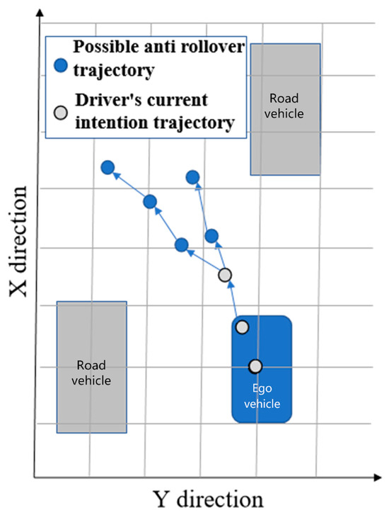 At this stage, research has only considered the impact of security to determine the starting point, end point, and corresponding candidate trajectory of the trajectory. In the anti-rollover trajectory planning problem of heavy vehicles in the human–machine cooperative driving scenario studied in this paper, it is necessary to consider both anti-rollover performance and obstacle avoidance performance [16]. When the driver’s behavior triggers the rollover risk threshold, the planning module replaces the driver to plan the anti-rollover trajectory; when the rollover risk drops below the threshold, the trajectory planning task is terminated, and the driver returns to control. The candidate trajectories may be of different lengths, and there is no fixed endpoint, as shown in Figure 1. It is difficult to determine the trajectory selection index through the existing known starting point and ending point. Therefore, to solve this problem, it is necessary to determine the candidate area in the environment that can balance the rollover risk and the collision risk instead of simply determining the candidate trajectory, and then an optimal trajectory in the candidate area is obtained through using the corresponding optimization method.