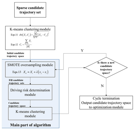 Because only a sparse set of points is obtained by solving the game model, a risk clustering fusion method based on Kmeans-SMOTE is proposed in this section to obtain candidate trajectory regions [19,20]. The process of data transfer, the generation of candidate trajectory generation, and the region’s generation are shown in Figure 3. The discrete trajectory that is set as the clustering object is clustered into the primary candidate trajectory space by using the k-means clustering algorithm, which provides conditions for the increase of the sample space. Then the SMOTE oversampling method is used to add minority class samples to combat small separation issues, which can obtain the filled candidate trajectory set. On this basis, the risk judgment module will re-judge the risk of the newly generated trajectories and propose trajectories with rollover risk and collision risk. The straight-road clustering process cannot generate new spaces, and the loop terminates.