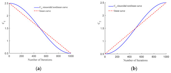 where , , , are parameters to be determined. Higher optimization results can be obtained when takes values from [0.5, 2.5] and takes values from [0.5, 2.5]. So, = 1, = 1.5, = 1 and = 1.5 can be determined. Figure 5 shows the curves of the acceleration factor c1 and c2 changing with the number of iterations.