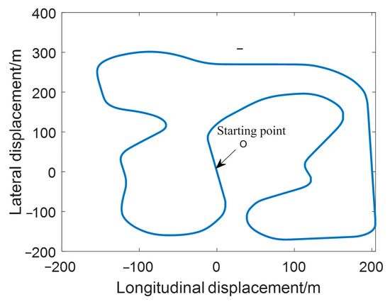 Aiming to verify the effectiveness of the driving risk clustering fusion algorithm proposed in this chapter, the designed simulation scene is shown in Figure 6. The scene contains a large number of curves. On the one hand, it mainly verifies the anti-rollover capability of the vehicle. On the other hand, it uses curves to simulate the driver’s emergency avoidance behavior after discovering obstacles. The curves within the simulated scenario span a range of radii from 25 m to 650 m, embodying a wide array of curvatures that mirror the majority of road conditions encountered in practical engineering contexts. This approach enables a comprehensive evaluation of the vehicle’s performance across diverse turning scenarios, ultimately ensuring the robustness of the driving risk clustering fusion algorithm under investigation. The road surface adhesion coefficient is set as 0.8, and the driver model is used to control the steering wheel angle during the simulation process shown in the equation, in which the principle is to output the input size of the steering wheel angle according to the deviation of displacement and the angle between the preview point and the actual trajectory.