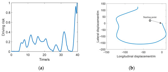 The driving risk triggering situation when the longitudinal vehicle speed is 50 km/h is analyzed, as shown in Figure 7. From the figure, the simulation terminates when the time is about 40 s. Since the simulation environment does not contain obstacles, it means that the vehicle has rolled over at this time, and the risk value of the vehicle rollover is 1. Therefore, in this section, the vehicle position at 40 s is used as the starting point to verify the effectiveness of the algorithm proposed in this paper for reducing vehicle driving risk and preventing rollover.
