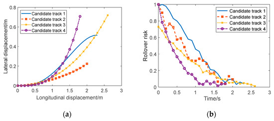 Sparse set of candidate trajectories and their driving risks. (a) Sparse set of candidate trajectories. (b) Candidate trajectory rollover risk.