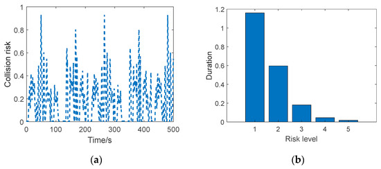 Then, when the longitudinal vehicle speed is selected as 35 km/h, the triggering situation of rollover risk is analyzed, which is shown in Figure 9. For the convenience of analysis, the rollover risk level is divided into five levels, that is, level 1 means 0.2 to 0.4, level 2 means 0.4 to 0.6, level 3 means 0.6 to 0.8, and level 5 means 0.8 to 1. Therefore, the purpose of trajectory planning is to reduce the global rollover risk of the controlled vehicle to below level 3 for passage safety.