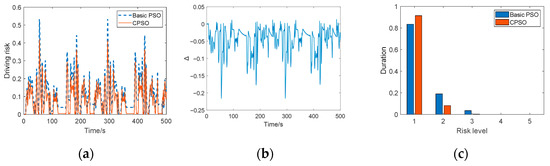 The risk values, their deviations, and the risk levels of the CPSO and basic CPSO algorithms are shown in Figure 11. By comparing the risk value of the optimized trajectory, the average driving risk obtained by the CPSO algorithm proposed in this paper is reduced by 23.84%, and the peak value is reduced by 33.19%, compared with the results obtained by the basic PSO algorithm. The duration of the risk level above level 1 is significantly reduced, indicating the effectiveness of the method proposed in this paper in reducing driving risks.