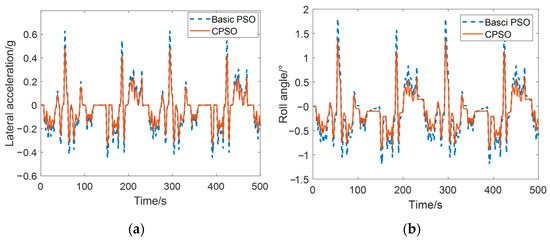 Then, the vehicle dynamics parameters corresponding to the optimized trajectory are compared. It can be seen in Figure 12 that the peak value of the lateral acceleration obtained by the method proposed in this paper is reduced by 33.58%, and the average value is reduced by 29.06%; the peak value of the roll angle is reduced by 18.26%, and the average value is reduced by 13.82%, compared with the results obtained by the basic PSO algorithm. This shows that the method proposed in this paper can effectively reduce the probability of instability and rollover of the controlled vehicle.