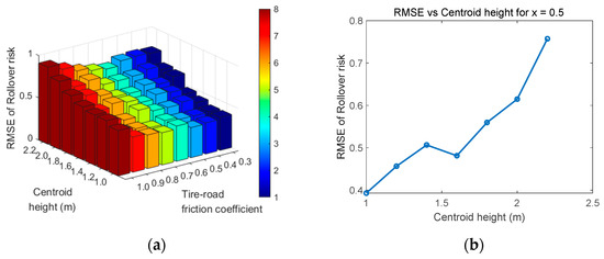 To verify the applicability of the algorithms proposed in this paper under different coefficients of adhesion and different centroid heights, simulations were conducted using the vehicle model, with the results shown in Figure 13. As can be seen from Figure 13a that when the coefficient of adhesion decreases, the mean square error of the rollover risk also decreases. When the coefficient of adhesion is 0.5, the mean square error of the rollover risk at different center-of-gravity heights is shown in Figure 13b. Analyzing the causes of the results, the smaller the coefficient of adhesion, the more likely the vehicle is to skid, and the rollover risk is paradoxically smaller. When the center-of-gravity height varies, there is an overall trend that the lower the center of gravity, the smaller the rollover risk.