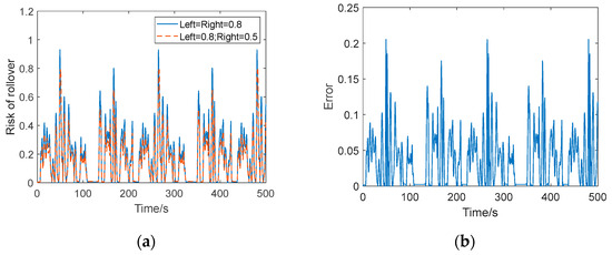 The rollover risk when the coefficients of adhesion on both sides are inconsistent is shown in Figure 14, with the left side at 0.8 and the right side at 0.5, and compared with the simulation results when both are at 0.8, it can be observed that although there are significant fluctuations, there is no obvious increase in rollover risk. This indicates that the algorithms proposed in this work can still ensure good control effects when the coefficients of adhesion on both sides are inconsistent.