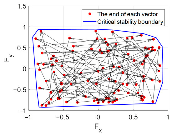 The projected polygon method has been widely recognized and utilized in existing literature to assess stability [23]. Further analysis of the vehicle rollover risk during simulation was conducted using the projected polygon method. Initially, the normalized critical stability boundary of the vehicle was obtained. Subsequently, the discrete data obtained during the full-condition simulation were processed and projected, yielding the results shown in Figure 15. In this figure, the blue solid line represents the critical stability boundary, while the red dots indicate the ends of the resultant vectors combining the longitudinal and lateral forces of the vehicle. Based on the analysis of the results, it is evident that the ends of the resultant vectors consistently remained within the critical stability boundary throughout the entire simulation process, indicating that the vehicle maintained stability and was not subject to any rollover risks throughout. This further validates the effectiveness of the present work.