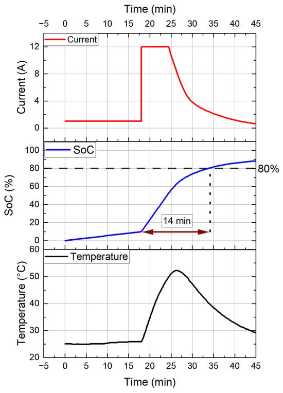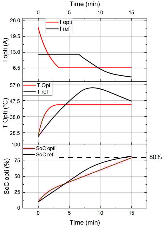 After 12 min, the current gradually decreases. This approach maintains the cell within an optimal temperature range while achieving an almost 80% SoC after 15 min, which was not feasible with the reference profile. By prioritizing maximum SoC, the MPC algorithm proposes a profile where the cell’s temperature is optimized at 30 °C, maximizing its capacity under these conditions.