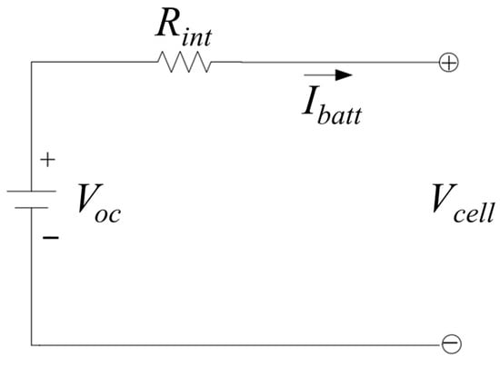 27], consists of a voltage source in series with a single resistance. According to the equivalent circuit model, the battery’s output voltage for the Li-ion cell is determined by the voltage drop caused by the battery’s open circuit voltage (OCV) and internal resistance (