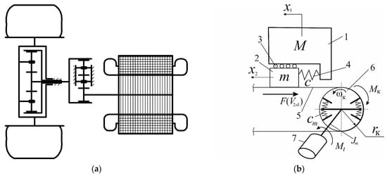 Drive scheme (a) and elastic-tire–solid-support-base interaction scheme (b): 1—mass M of the cushioned vehicle parts attributed to the wheel; 2—the wheel mass m; 3—rollers; 4—spring; 5—support base; 6—rolling wheel; 7—traction motor (TM); c—spring stiffness; x1, x2—longitudinal displacements of masses 1 and 2, respectively; F(V2sk)—friction force depending on the wheel slip speed V2sk relative to the support base; ωK—angular wheel speed; rK—distance from the wheel center to the support base; Mt—braking torque developed by the TM; cm—angular ‘electromagnetic stiffness’ of the synchronous TM with permanent magnets; Jm—inertia moment of the motor’s rotating parts, referred to the rotor; MK—braking torque developed by the wheel brake mechanism.