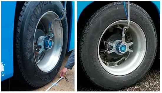 In addition to recording data from the CAN bus, the values of torque and angular velocities on the drive wheels were recorded using Kistler RoaDyn (Kistler Holding AG, Winterthur, Switzerland) strain gauge wheels. Measuring wheels installed on the hub of the drive wheels are shown in Figure 4. Using recording equipment IMC-CRFX-400 (imc Test & Measurement GmbH, Berlin, Germany), the values of the torque and the speed of the rotation of the drive wheels were recorded.