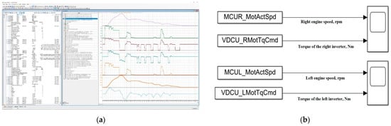 To capture data, a Vector VN1630A adapter was used to connect the CAN network to the computer. Vector CANoe 8.0 software was used for data analysis. The working window of the Vector CANoe program is shown in Figure 3a and the MATLAB Simulink is shown in Figure 3b.