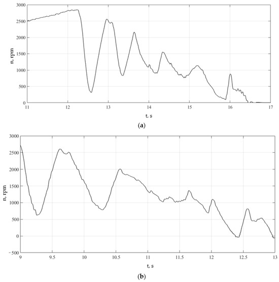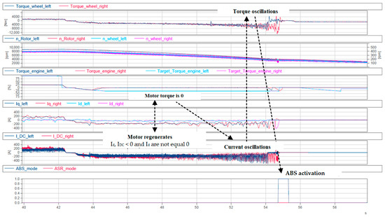 During these tests, self-excited oscillations in the interaction zone were observed and recorded until the ABS activation, confirming analytical findings. Figure 4 shows that during braking, self-excited oscillations of the torque, wheel-rotation frequency, and currents in the motor windings Iq, Id, and the DC link IDC occur. There is a noticeable increase in the amplitude of oscillations of the torque and rotation frequency just before the ABS activation. This braking process was accompanied by increased oscillations of the vehicle support base, which causes increased dynamic loads on both the drive’s mechanical part and the elements of the supporting and cushion systems, and negatively affects the driver and passengers.