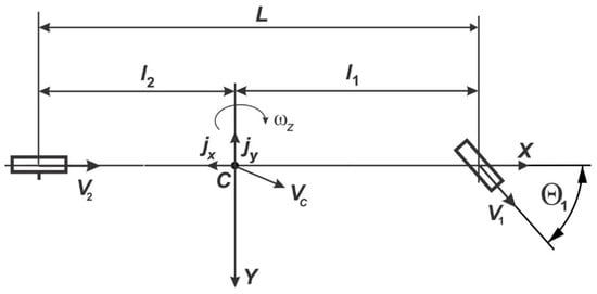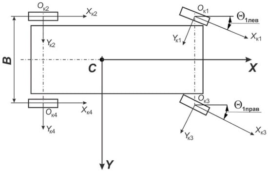 To determine the current linear speed of the wheel centers during braking, consider the design scheme in Figure 6. For the front axle wheels, the projections VKX1,3 and VKY1,3 of the linear speed of the wheel centers on the CXY mobile coordinate system axes are determined as follows: