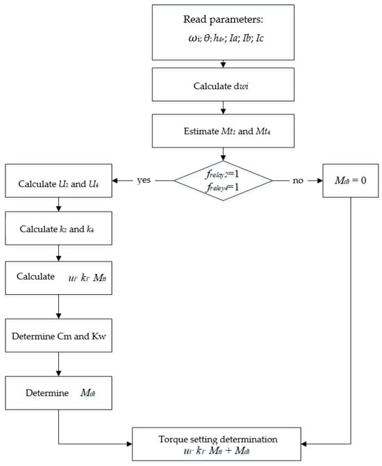 - Calculate the angular stiffnesses and using Formula (12):where are the increments of electromagnetic torque estimates and wheel angular speed ; is current and previous times.