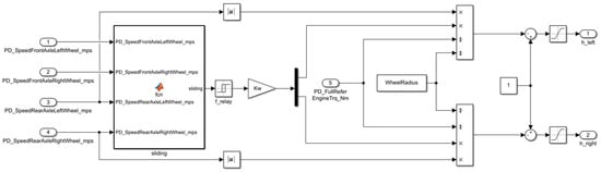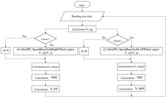 - Calculate diagnostic signs of slipping and using Formula (7) and functions and according to Figure 7 for left and right drive wheels.