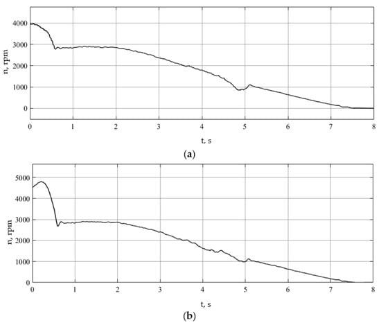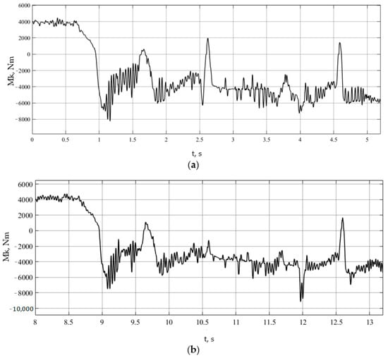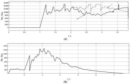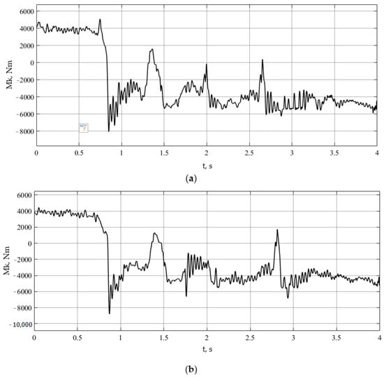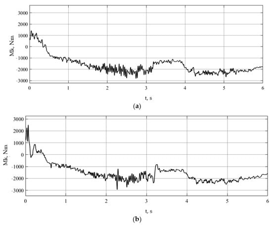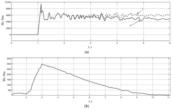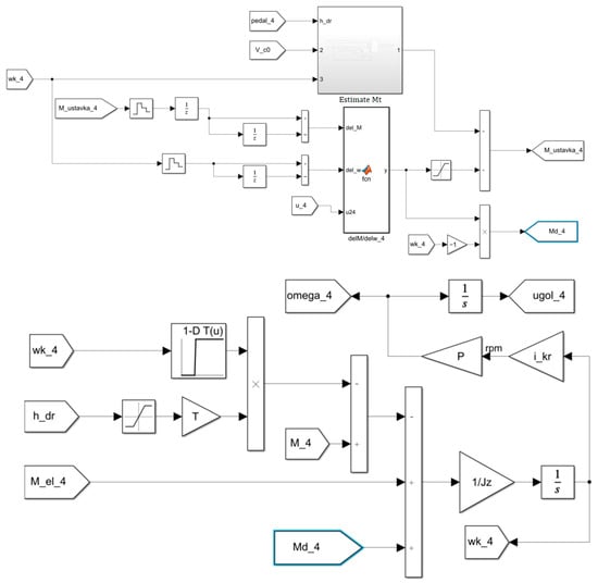 As noted above, during braking, self-excited oscillations may occur for both the translational motion of elements associated with the body 1 and the rotational motion of elements associated with the rotor shaft 7 (Figure 1b). For vehicles with individual traction drives, increased slip and blocking during full slip can be eliminated, and self-excited oscillations suppressed by controlling the motors during regenerative and combined braking. Studies [41,42] consider self-excited oscillations as those with negative damping, associated with the main motion and losing stability, and can be eliminated by excluding the motion causing them from the system. Upon detecting increased wheel slip, the control system should assess the regenerative torque on the motor shaft and the resistance torque on the wheel, and calculate the value of additional damping torques to eliminate negative damping in the wheel–road system.